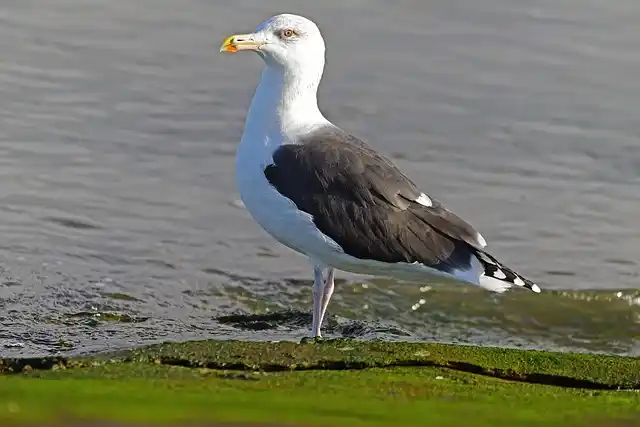 De grote mantelmeeuw heeft zwarte vleugels en een wit verenkleed. De poten zijn vaalroze en de grote mantelmeeuw is een stuk groter dan de kleine mantelmeeuw.