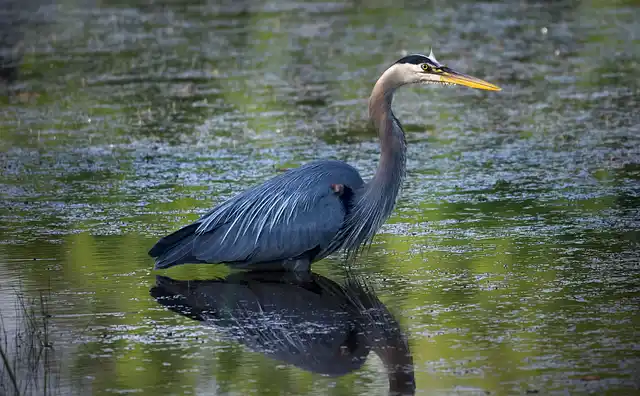 • Deze reiger heeft een voornamelijk grijs verenkleed en heeft een geeloranje snavel.